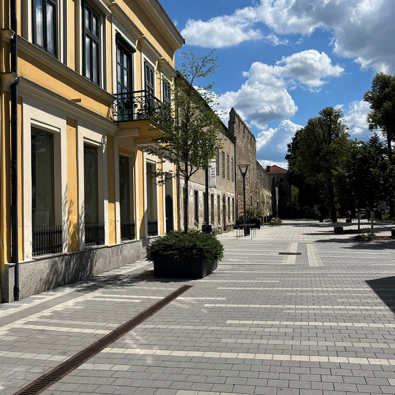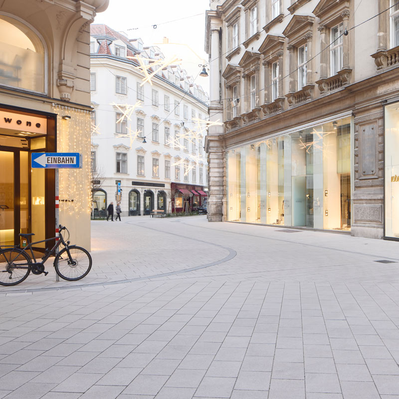A Clemens Kirsch Architektur építésziroda eltérő színfokozatú (keresztirányú) csíkokból álló hatásos térkőburkolatot tervezett a Wiener Neustadt-i Wiener Straße sétálóutca felületi kialakításához. Clemens Kirsch, okleveles mérnök: „A viszonylag hosszú utcát egyrészt tagolni, másrészt lazítani kellett. A cél az volt, hogy szín és arányok tekintetében változatos térkőburkolatot hozzunk létre, és ezáltal folyamatosan ismétlődő mintaszakaszt határozzunk meg. Ez az elrendezés egyrészt megkönnyíti az építkezés menetét, másrészt úgy választottuk meg az összeállítást, hogy a járókelők ne vegyék észre az ismétlődést. A csíkok koncepciója frissességet és élénkséget kölcsönöz az utca nyomvonalának anélkül, hogy nyugtalan hatást keltene.”