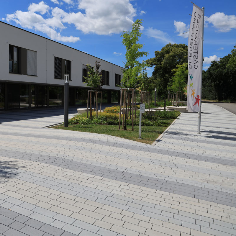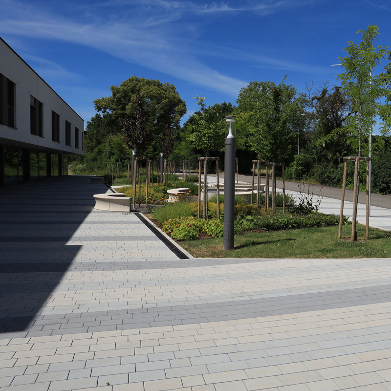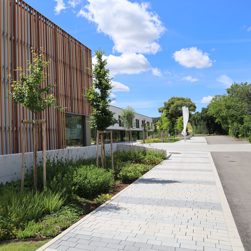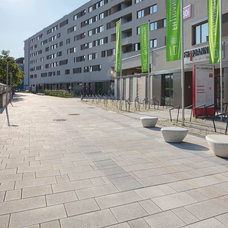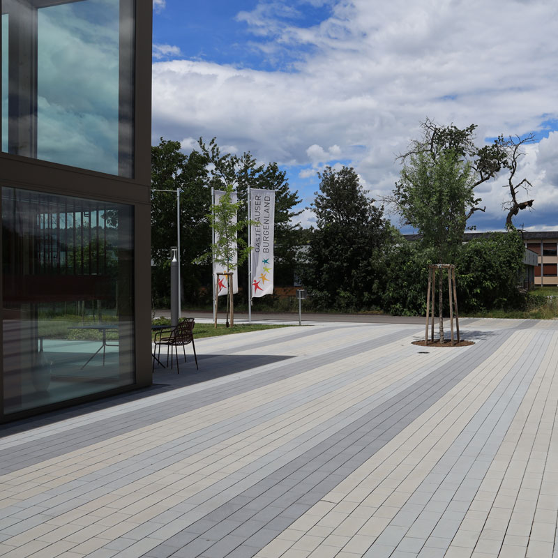 Az egyetem területén használt, Friedl Steinwerke által gyártott térkövek és nagy méretű lapok VG4 elmozdulásgátlóval vannak ellátva, ami a köveknek szilárd rögzítést biztosít, a fuga pedig nagy igénybevétel esetén és hosszú távon is egyenletes, esztétikus marad. A terhelhetőség mellett a betonkövek további előnye a csúszásmentesség, az egyszerű gondozás, valamint a fenntarthatóság és az újrahasznosíthatóság. A térkőfelületek életciklusköltségei – az anyag előállításától az élettartam végén történő újrahasznosításig – a térkő mellett szólnak.